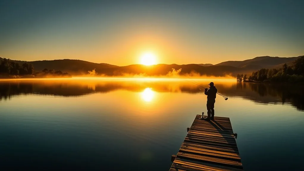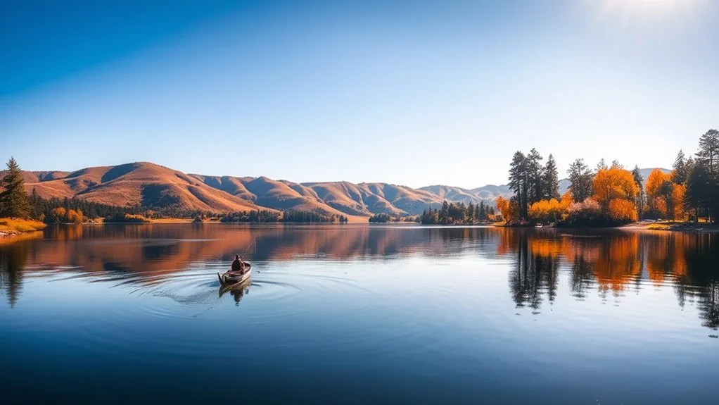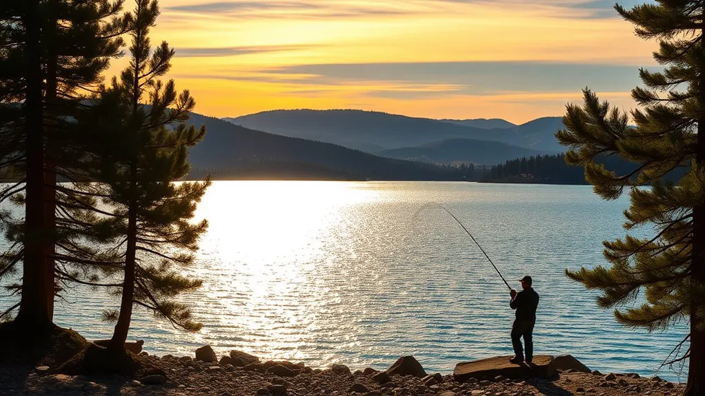 Before casting your line, guarantee you have a fishing license if you're 16 or older, and check specific regulations, particularly for species like salmon and sturgeon. The lake's facilities enhance your experience with lakefront RV and tent camping, a marina, boat rentals, and a variety of recreational activities. Warm your fishing skills with effective trolling for trout in deeper waters during summer or try casting plastics for bass along the brushy shorelines.
